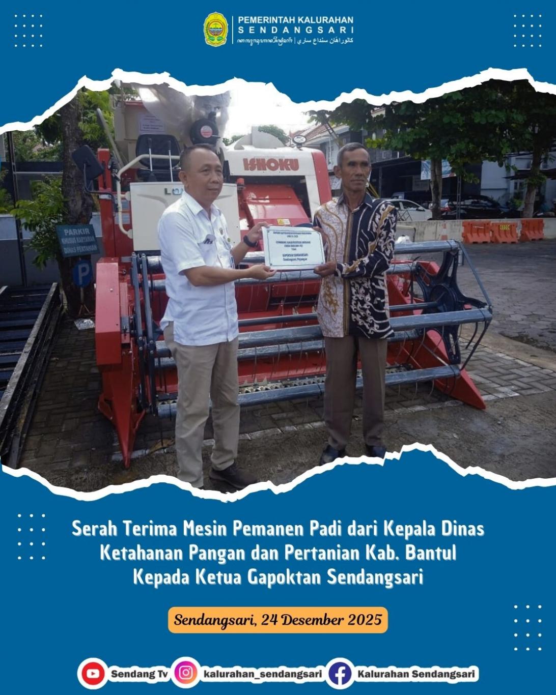 (Rabu, 24/12/2025) Pemerintah Kalurahan Sendangsari melalui Gapoktan Sendangsari menerima mesin pemanen Padi dari Ditjen Tanaman Pangan Kementerian Pertanian Republik Indonesia.