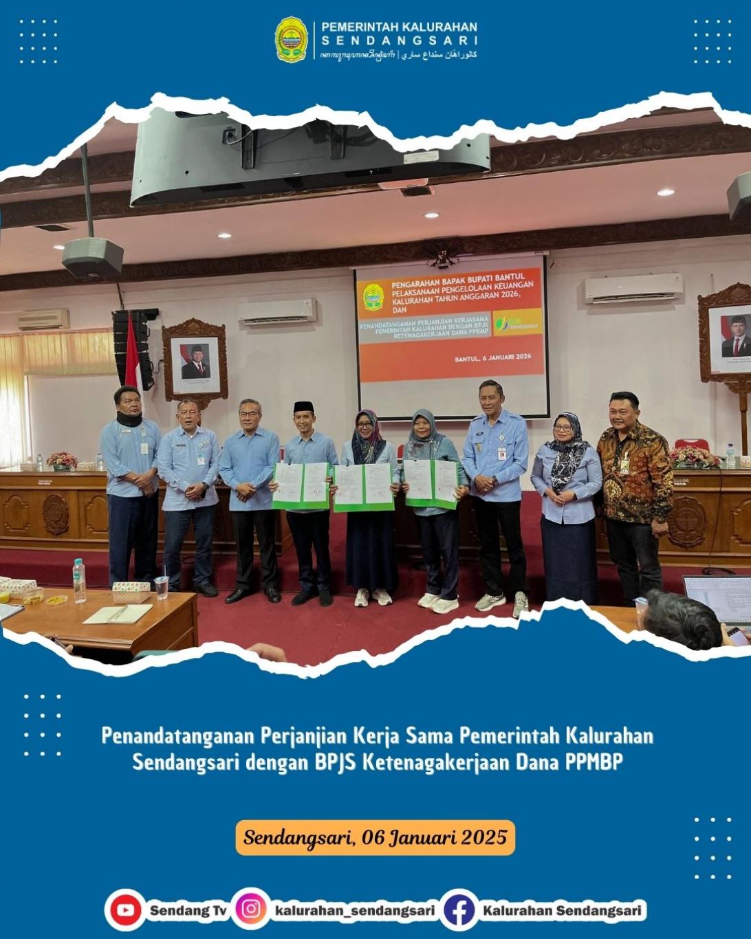 Bantul (06/01/2026) — Lurah Sendangsari menghadiri kegiatan Pengarahan Bupati Bantul tentang Pelaksanaan Pengelolaan Keuangan Kalurahan serta Penandatanganan Perjanjian Kerja Sama antara Pemerintah Kalurahan Sendangsari dengan BPJS Ketenagakerjaan terkait penyelenggaraan jaminan ketenagakerjaan bagi sejumlah lembaga kalurahan dan tokoh masyarakat, meliputi RT, LPMK, Kader Kesehatan, Karang Taruna, FPRB, Linmas, serta Kaum Rois yang tersebar di seluruh padukuhan di Kalurahan Sendangsari.