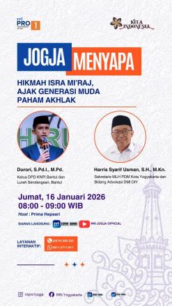 Lurah Sendangsari, Durori, S.Pd.I., M.Pd., menjadi salah satu pembicara dalam program Jogja Menyapa yang disiarkan langsung oleh RRI Pro 1 Yogyakarta, Jumat (16/1/2026) dalam dialog bertema “Hikmah Isra Mi’raj, Ajak Generasi Muda Paham Akhlak”. Program yang berlangsung pukul 08.00–09.00 WIB ini juga menghadirkan Harris Syarif Usman, S.H., M.Kn. dan dipandu oleh host Prima Hapsari. Siaran ini dapat putar ulang melalui kanal Youtube RRI Jogja Official dengan link berikut https://www.youtube.com/live/LbJgMGI6Hu0?si=aVnqMZcP-dkae4iG