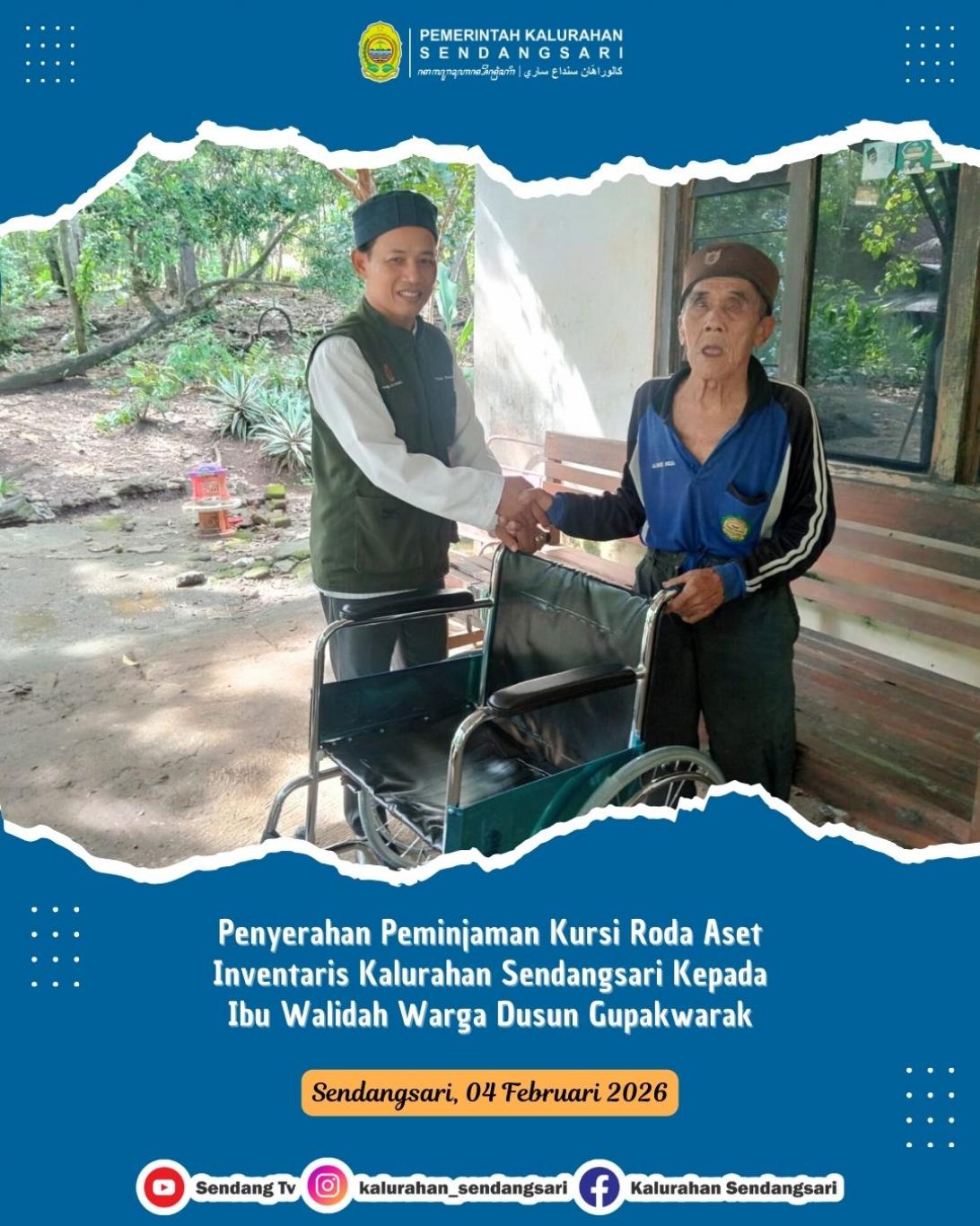 Pemerintah Kalurahan Sendangsari melakukan penyerahan peminjaman kursi roda yang merupakan aset inventaris kalurahan kepada Ibu Walidah, warga Dusun Gupakwarak, pada Rabu, 4 Februari 2026.