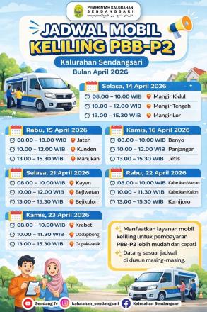 Berikut kami sampaikan jadwal mobil keliling pembayaran Pajak Bumi dan Bangunan (PBB) P2 di Kalurahan pada bulan April 2026. Mari manfaatkan layanan mobil keliling ini untuk pembayaran PBB yang lebih mudah dan cepat.