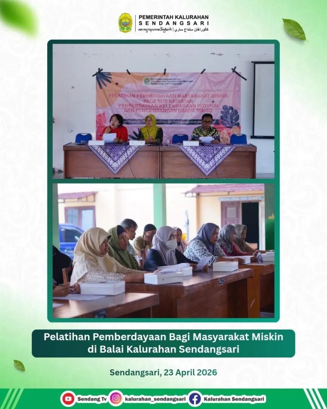 Dinas Koperasi Kabupaten Bantul mengadakan pelatihan pemberdayaan bagi masyarakat miskin di Kalurahan Sendangsari dan sekitarnya pada Kamis, 23 April 2026 di Balai Kalurahan Sendangsari.